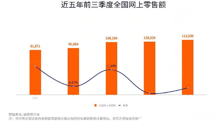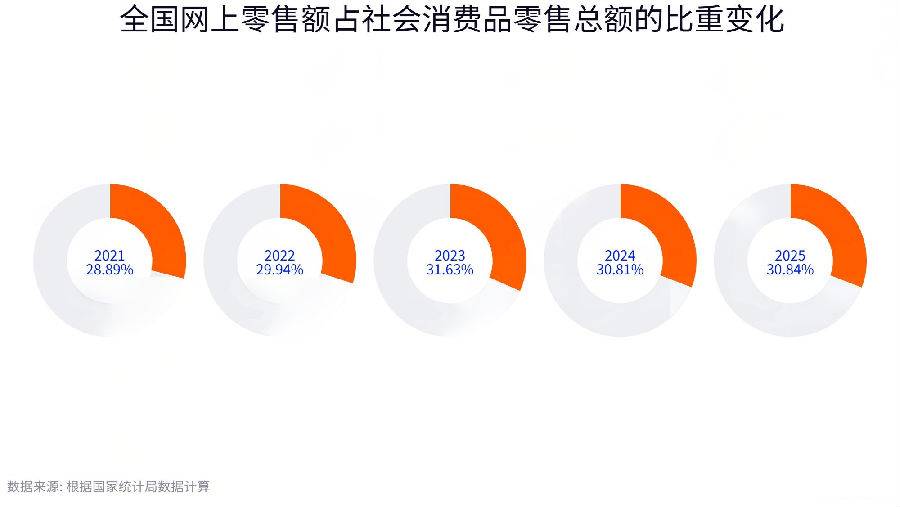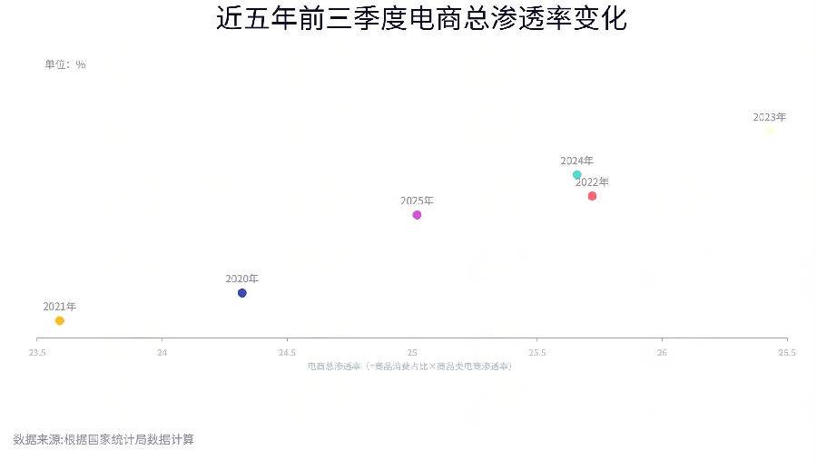 国家统计局数据显示,今年前三季度社会消费品零售总额36.59万亿元,全国网上零售额占社会消费品零售总额的比重为30.84%,这一占比已维持近5年,电商总渗透率为25.02%,创下近四年新低。
