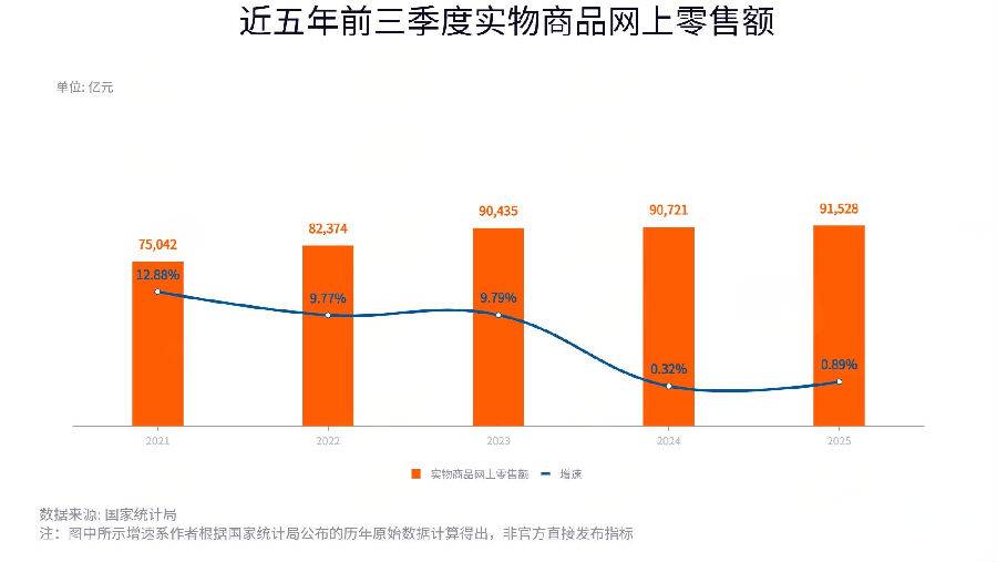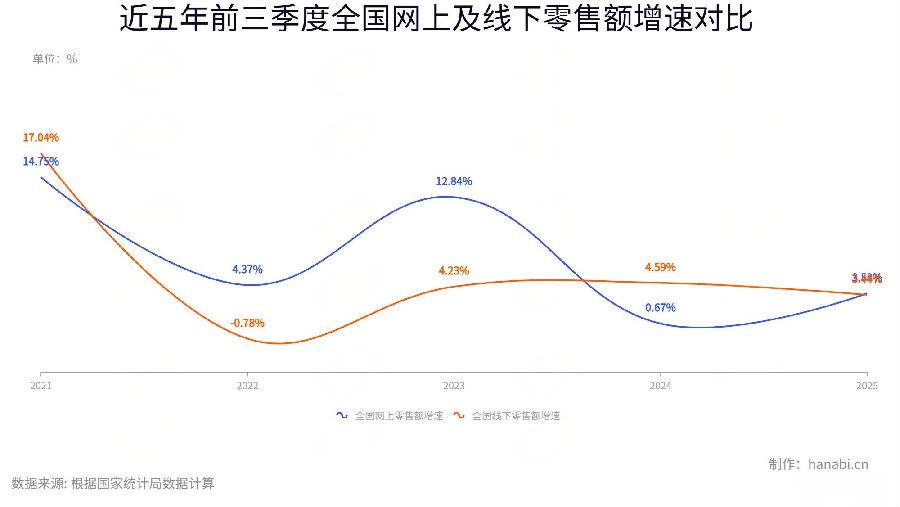 线上增速进入低增长新常态。国家统计局数据显示,全国网上零售额增速从2021年前三季度的14.75%一路下滑,2024年前三季度在零增长区间徘徊,尽管2025年前三季度小幅反弹至3.58%,但已进入个位数增长时代。