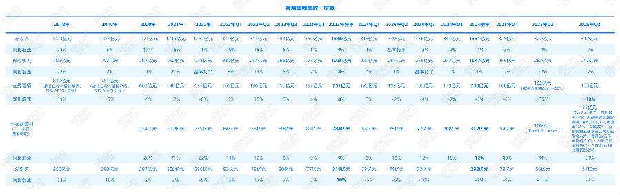 2025年第三季度,百度营收312亿元,同比下滑7%;核心业务营收247亿元,同比下滑7%;调整后的季度净利润37.7亿元,同比下滑35.9%。其中在线营销营收157亿元,同比下滑18%,已连续6个季度下滑,跌幅呈扩大趋势(Q1下滑6%,Q2下滑15%)。与之相对,QuestMobile数据显示,2025年Q3互联网广告市场规模1875.1亿元,同比增长6.4%。