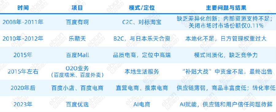 在电商方面,百度的"梦想"从未熄灭。2007年,百度悄悄成立电商事业部,次年10月,对标淘宝的百度电商“有啊”上线,号称“3年超越淘宝”。没到3年,“有啊”退场,被戏称“没了”。2010年3月,本地生活服务平台“爱乐活”上线,因补贴不足被出售。2013年,“爱乐活”转型导购网站“百度逛街”,2014年又转型时尚类B2C商城“百度Mall”,2015年百度入局O2O,整活“百度外卖”,扬言先砸200亿构建百度糯米O2O生态圈,2017年8月,百度糯米卖身饿了么。