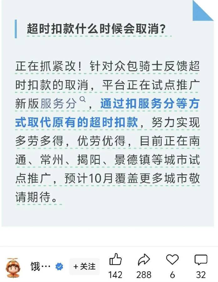而在一个多月前,京东外卖也宣布已在深圳、南京、哈尔滨、武汉等全国25个城市试点取消骑手订单超时罚款,转为启用“服务分”管理机制。