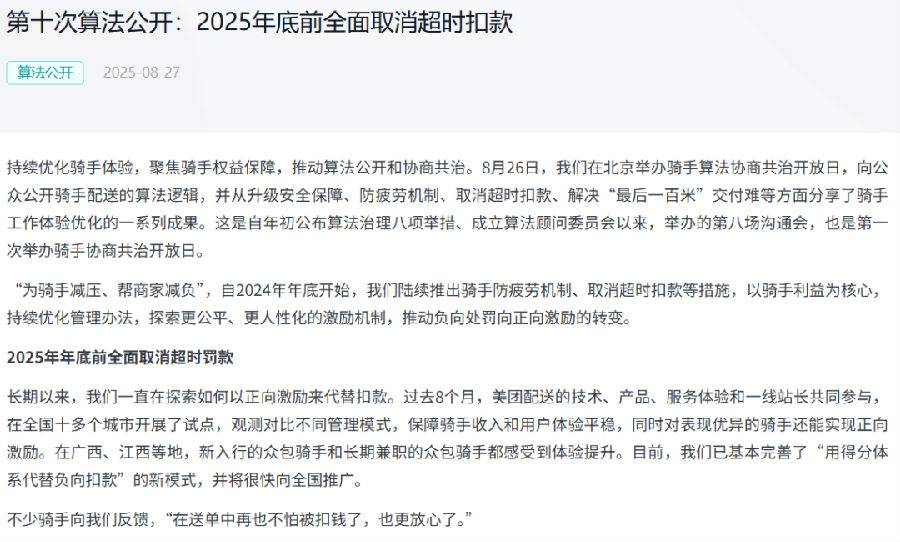 截至今年8月,该机制已在22个城市落地试行。美团方面表示,将在今年年底前全面取消超时罚款。