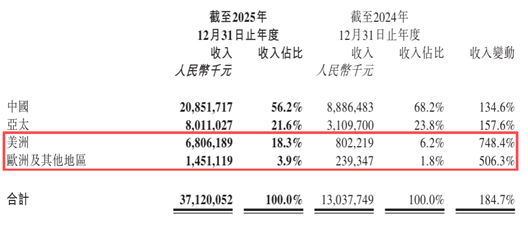 2025年,其海外收入达到162.7亿元,同比增长291.9%,占比从31.8%提升至43.8%。